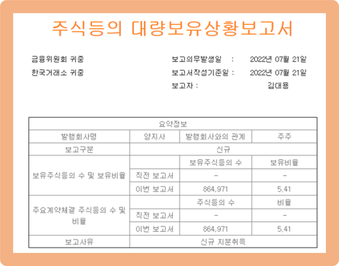 2022년 7월 22일, 개인투자자인 39세 김대용씨가 양지사 지분 5.25%에 달하는 839,100주를 취득했다는 공시가 발표되었습니다.