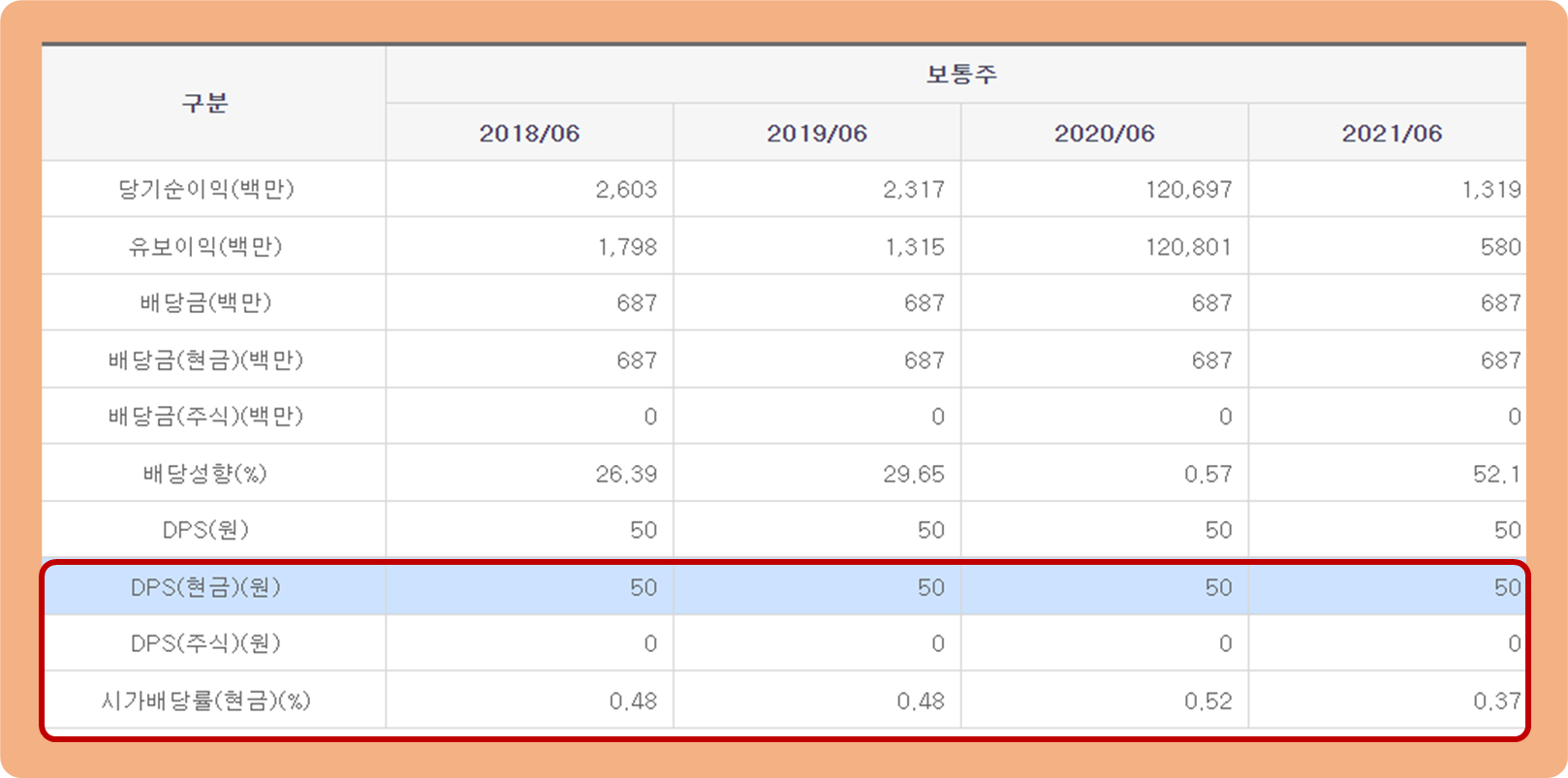 지난 2018~2021년 4년 간 이 기업은 1주당 50원의 배당을 실시하고 있습니다.