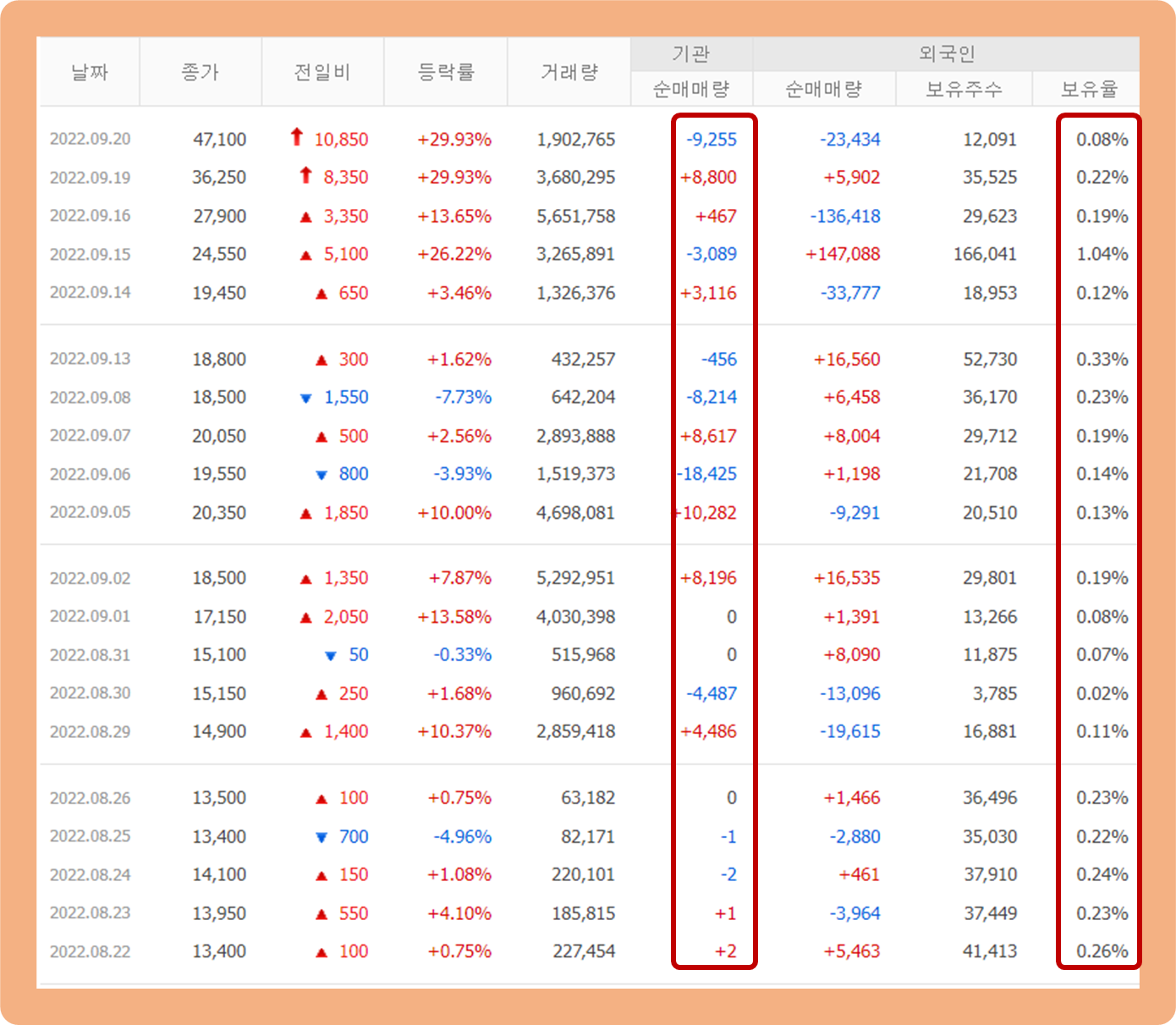지난 1개월 간 기관 투자자 및 외국인 투자자의 주식 거래 추이에 대해 살펴보도록 하겠습니다.