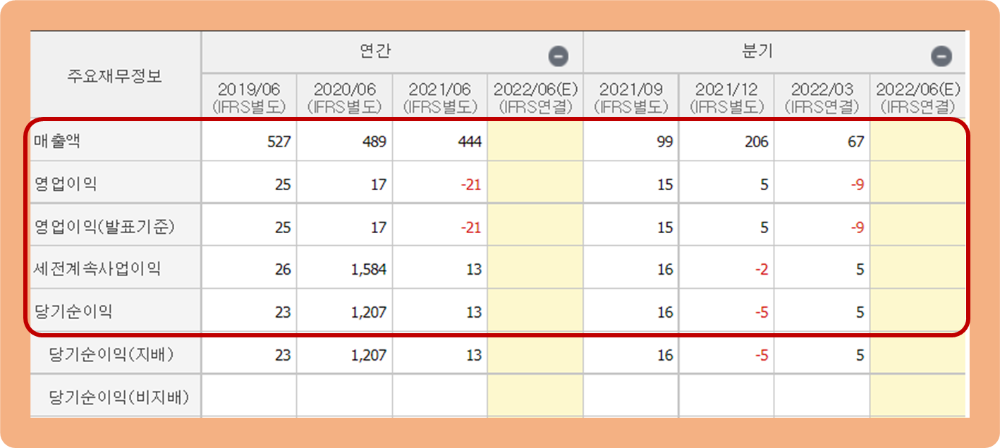 2021년 기준 연간 당기순이익은 13억원을 기록하며, 약 1,207억원 수익을 냈던 전년의 약 0.8% 수준까지 떨어졌네요.