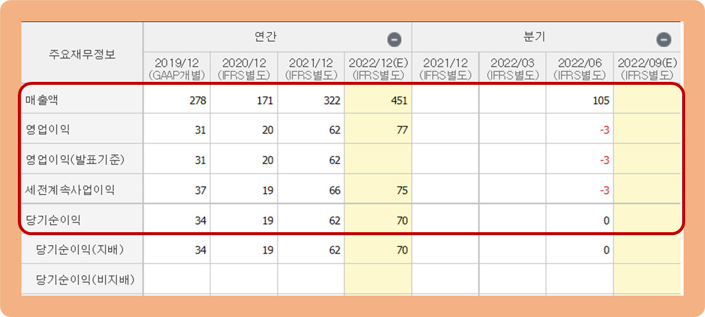 2021년 기준 연간 영업이익 : 약 62억원을 기록하며 전년 대비 210% 상승했습니다.