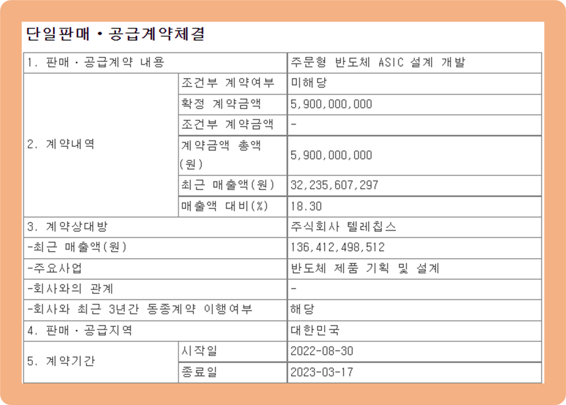 2022년 8월 31일, 당사가 텔레칩스와 약 59억원 규모의 주문형 반도체 ASIC 설계 개발 계약을 맺었다는 공시를 발표했습니다.