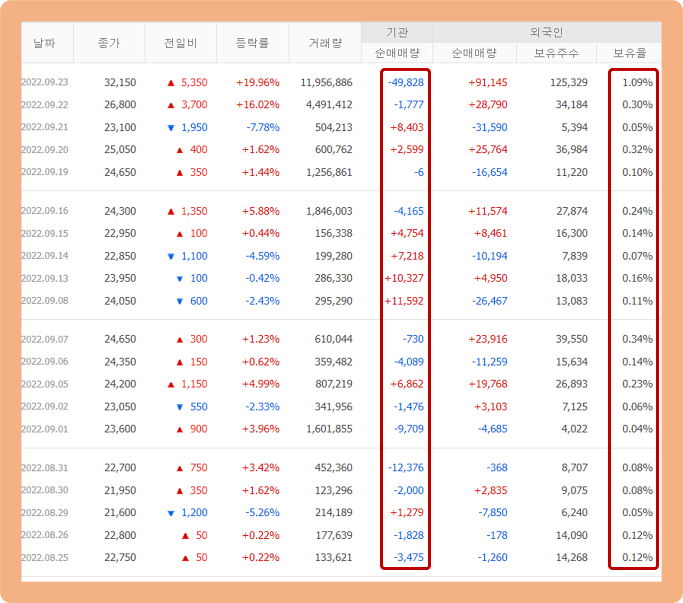 지난 1개월 간 기관투자자 및 외국인 투자자의 주식 매매 추이에 대해 살펴보도록 하겠습니다.