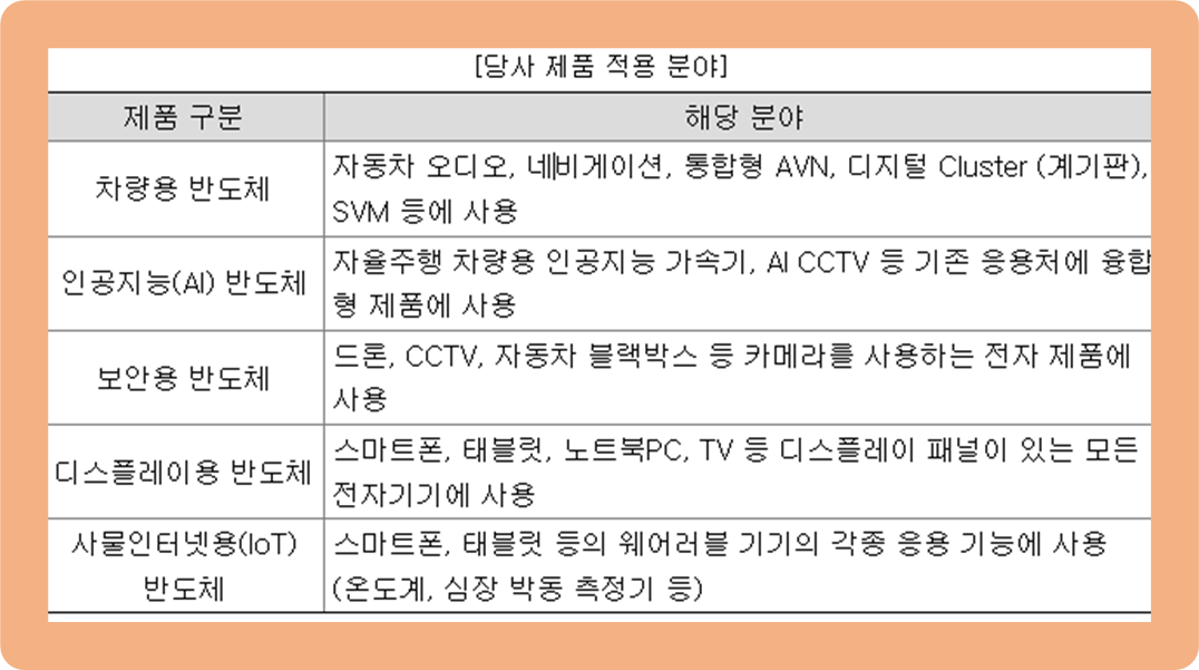 차량용(네비게이션 등), 인공지능(AI CCTV 등), 보안용(드론, CCTV 등), 디스플레이용(스마트폰, 노트북 등), 사물인터넷용 등 반도체 전반에 걸쳐 광범위한 분야에 적용되고 있습니다.