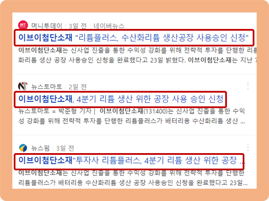 이브이첨단소재 주가, 투자사 리튬플러스 공장 사용 승인 신청 소식