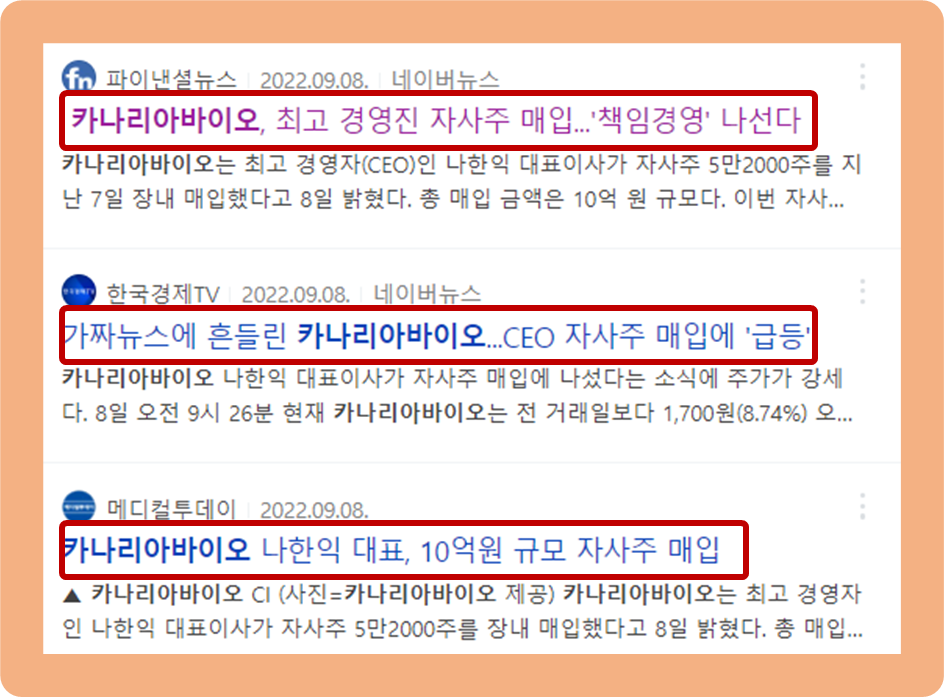 2022년 9월 8일, 카나리아바이오의 나한익 대표이사가 자사주 52,000주를 전 날 장내 매수했다는 소식을 발표했습니다.