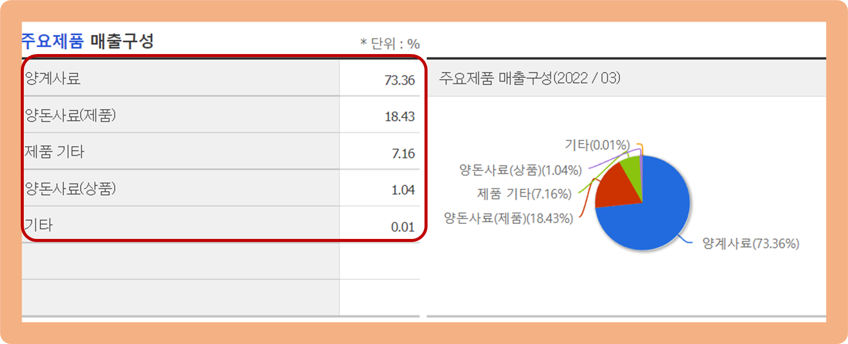 우선 양계사료 부문이 약 73.4%로 총 매출의 대부분을 차지하고 있구요.