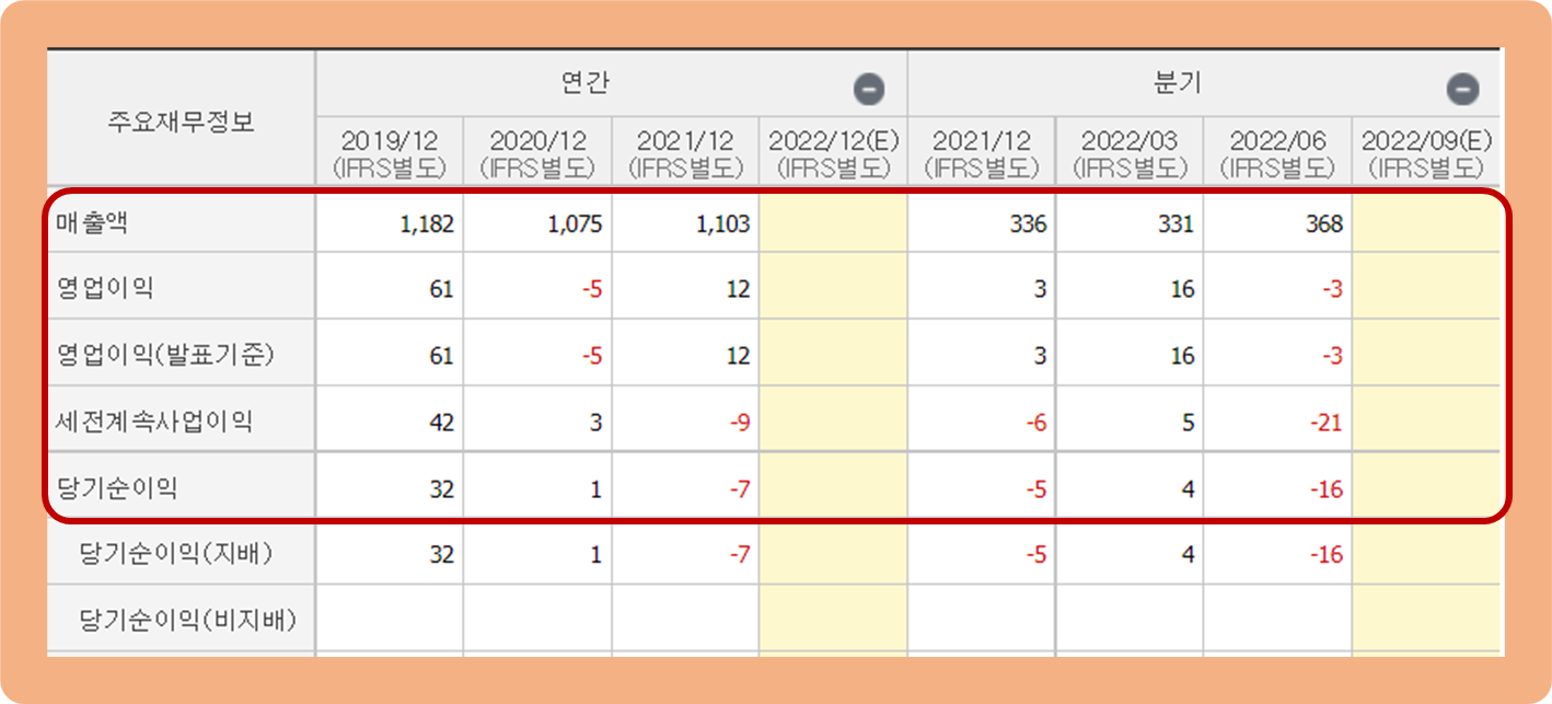 아쉽게도 2021년 기준 연간 당기순이익은 -7억원 손실을 기록하며 매출액, 영업이익과 달리 적자로 전환되버린 상황이네요.