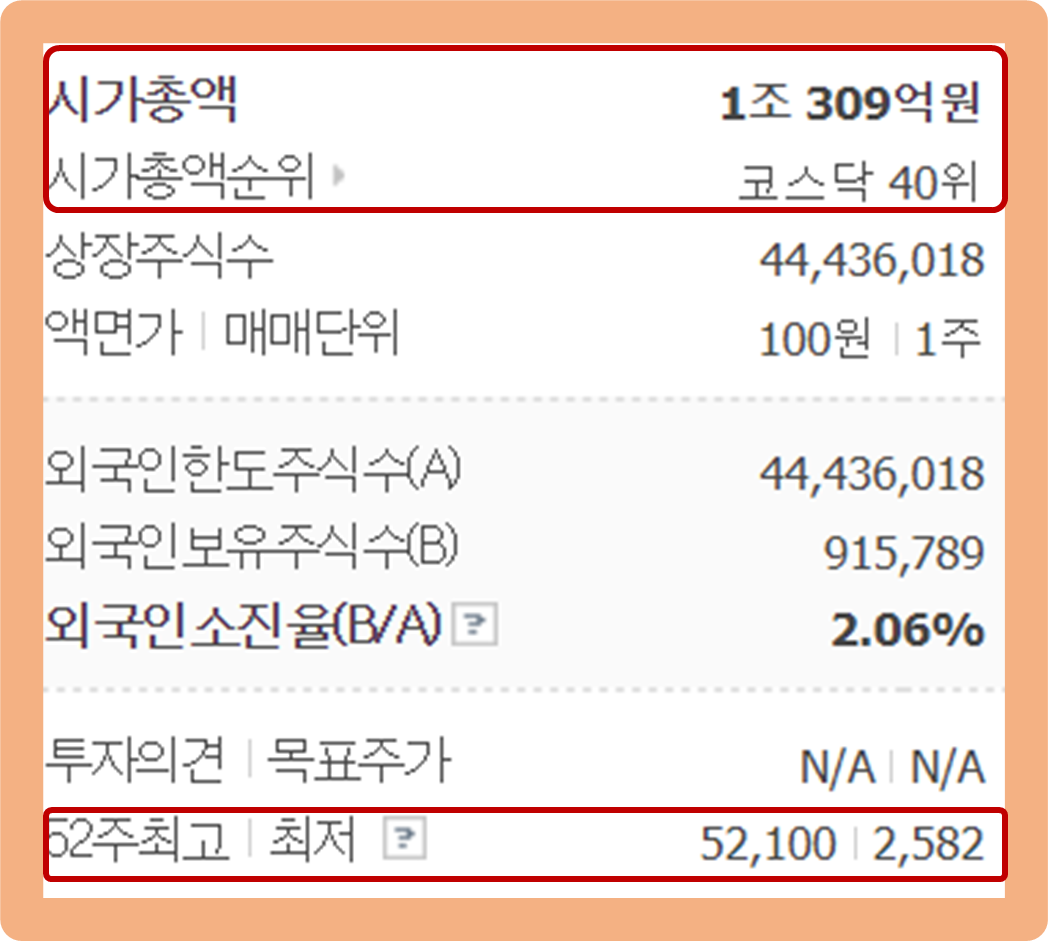 52주 최고가는 52,100원이며, 52주 최저가는 2,582원이네요.