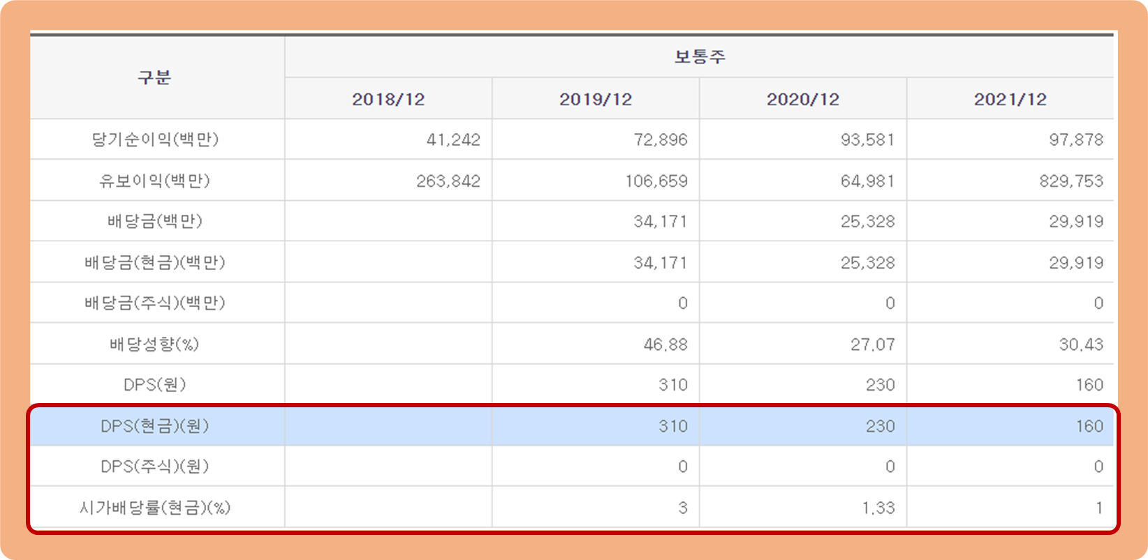 2019년 : 310원 / 2020년 : 230원 / 2021년 : 160원의 배당을 실시했습니다.