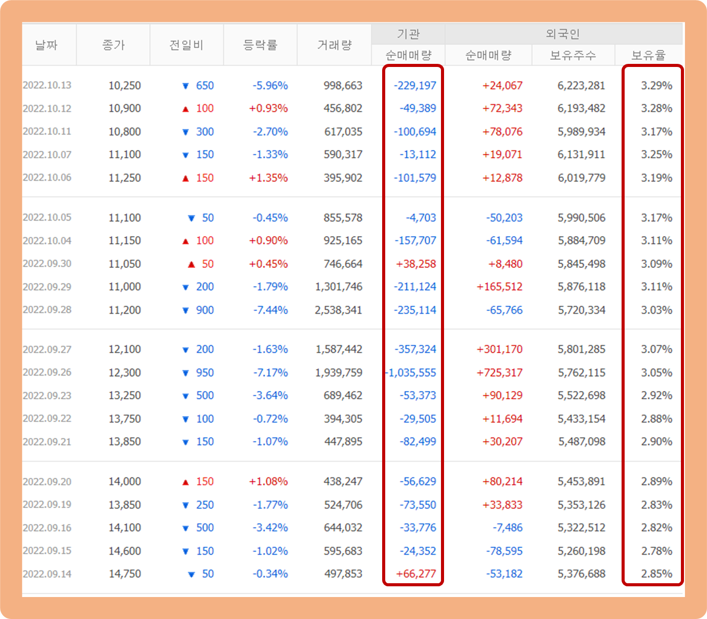 우선 기관투자자의 경우 지난 1개월 간 매도세가 월등히 우위를 점하고 있구요.