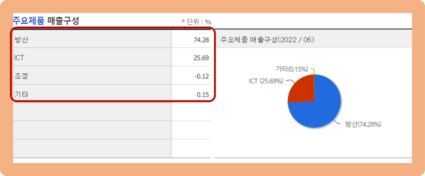 우선 방산 부문이 약 74.3%로 총 매출의 대부분을 차지하고 있구요.