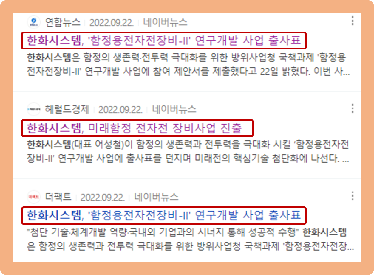 2022년 9월 22일, 한화시스템이 방위사업청 국책과제인 함정용전자전장비II 연구개발 사업에 참여 의향 제안서를 제출했습니다.