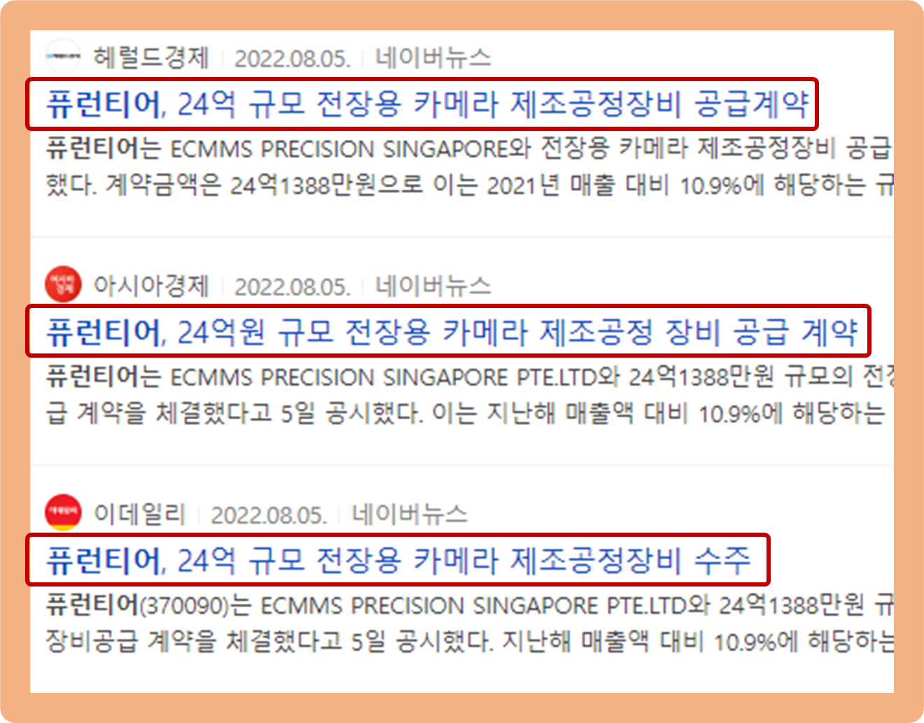 2022년 8월 5일, 퓨런티어가 ECMMS PRECISION SINGAPORE PTE(전기전자제품 생산 및 판매업 영위)와 전장용 카메라 제조공정장비 공급 계약을 체결했습니다.