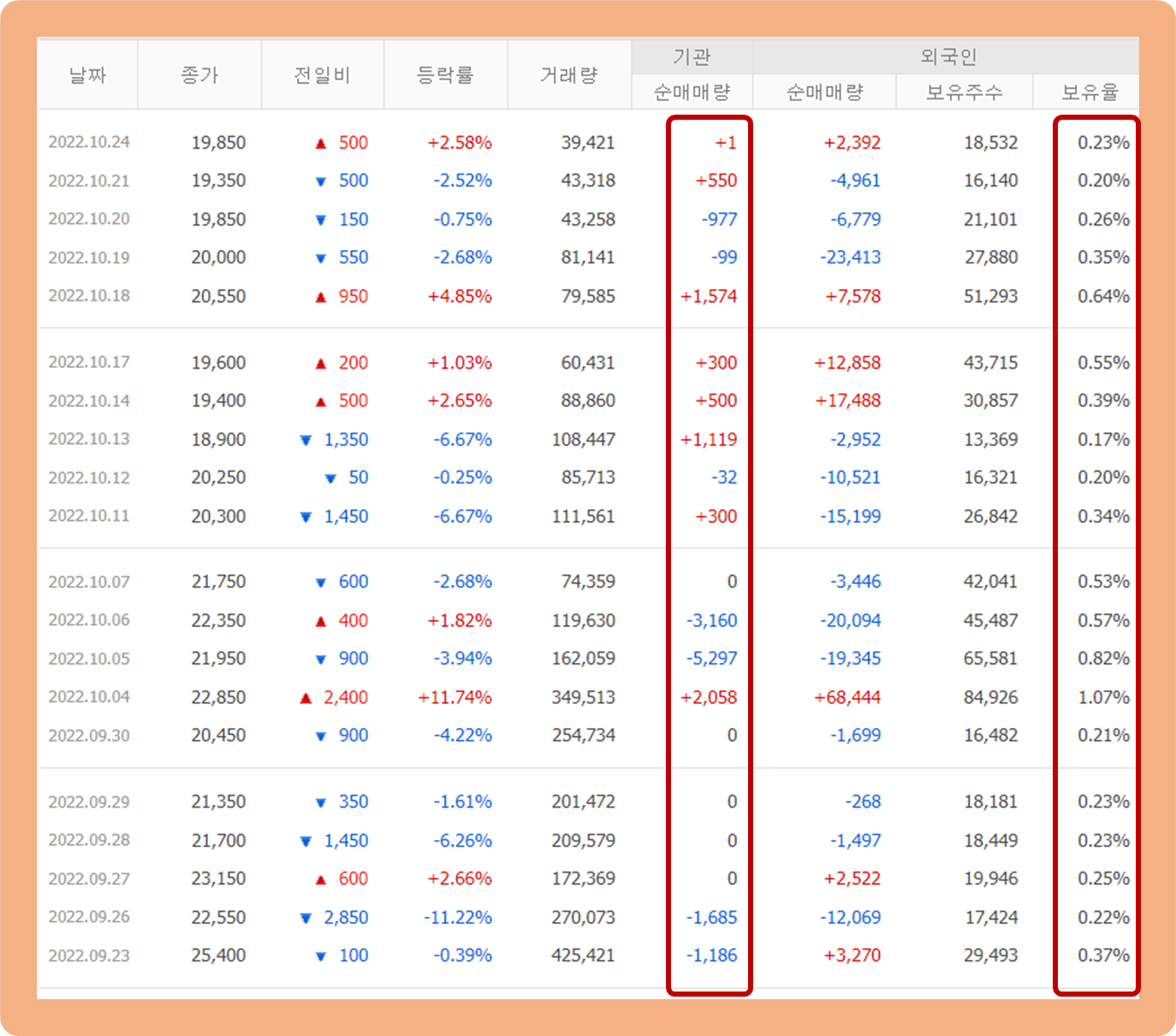 지난 1개월 간 기관투자자 및 외국인 투자자 주식 매매 동향에 대해 살펴보도록 하겠습니다.