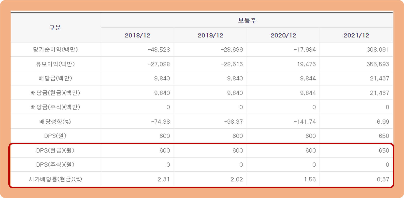 2018년, 2019년, 2020년 : 600원 / 2021년 : 650원의 배당을 실시했습니다.