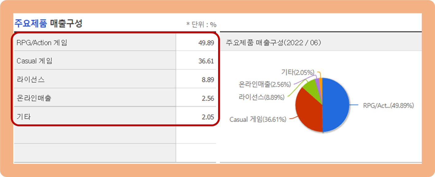 RPG/액션 게임 부문이 약 49.9%로 총 매출의 절반 수준을 차지하고 있구요.