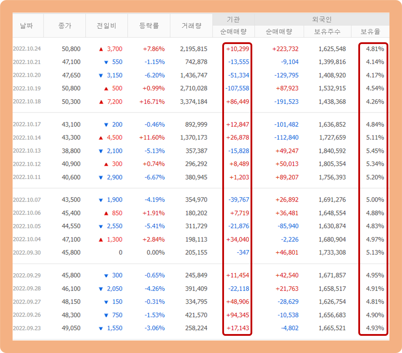 우선 기관투자자의 경우 지난 한 달 간 매수세가 매도세에 비해 우위를 점하고 있구요.