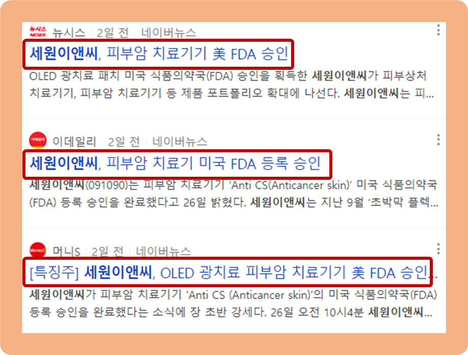 2022년 10월 26일, 세원이앤씨의 피부암 치료기기인 'Anti CS’가 미국 FDA 승인을 완료했다는 소식을 발표했습니다.