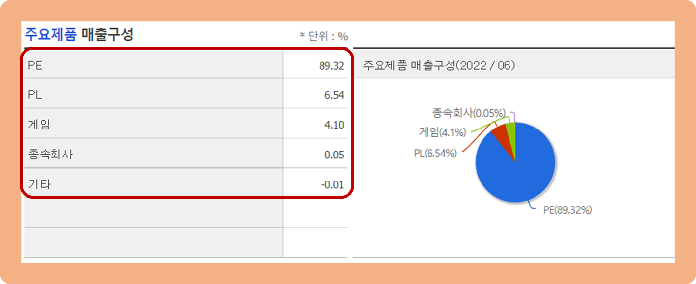 우선 PE(화공) 부문이 약 89.3%로 총 매출의 대부분을 책임지고 있구요.