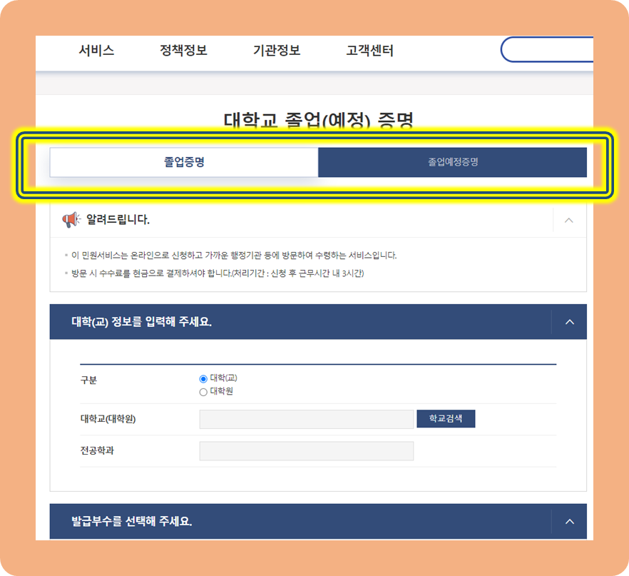 위에 두 가지 메뉴가 있습니다: 졸업증명서와 졸업예정증명서입니다.