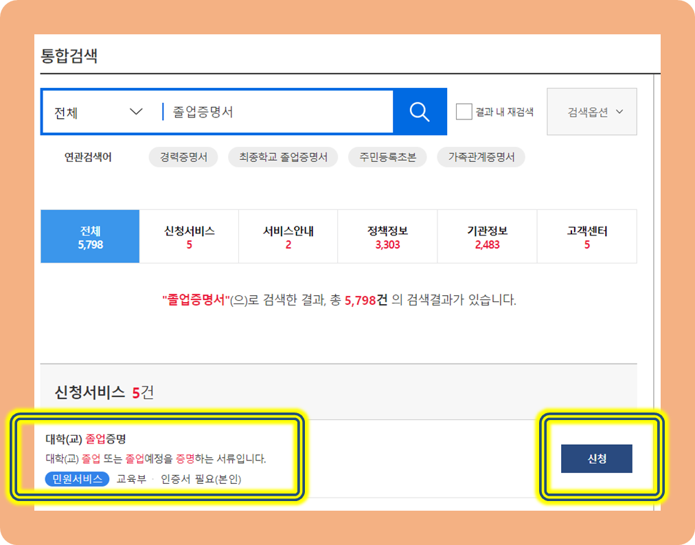 졸업증명서를 이렇게 입력 후 검색을 하세요.
