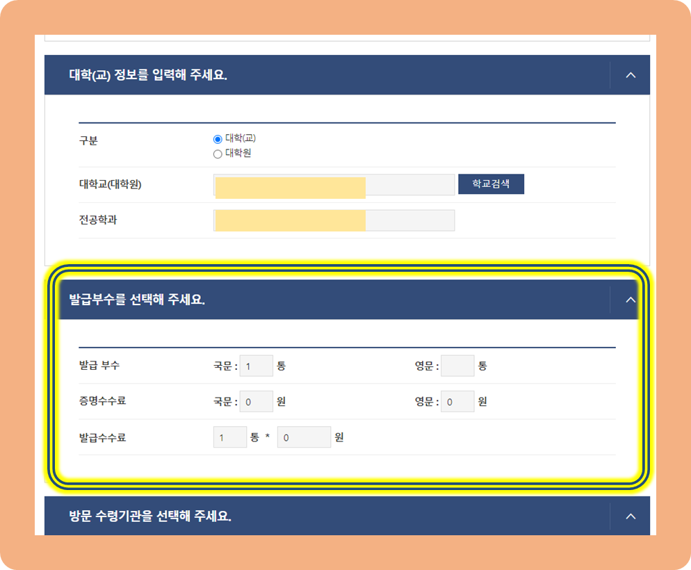 선택한 후에는 졸업한 학교의 이름과 전공을 입력해 주십시오.