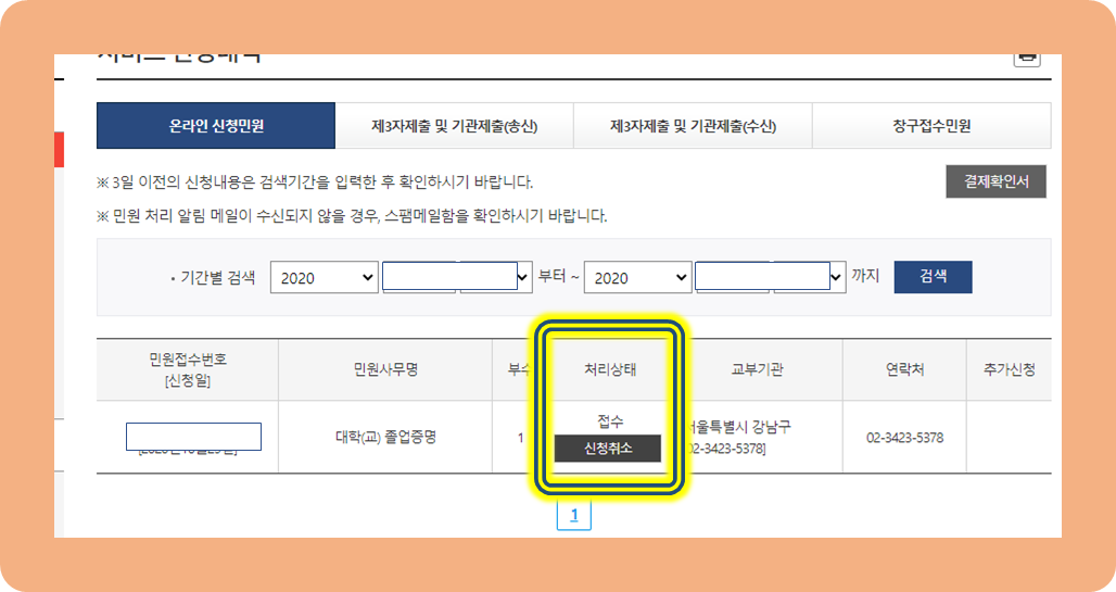 5~10분 정도 지나면 "접수"이라고 쓰여 있던 부분이 "처리 완료"로 변경됩니다.