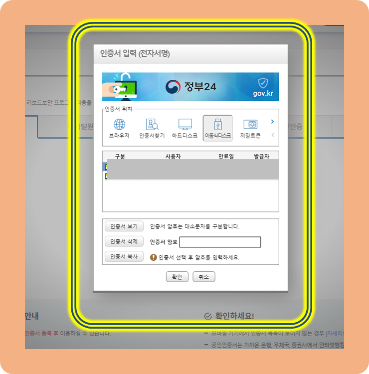 여기서 원하는 인증서를 선택할 수 있습니다.