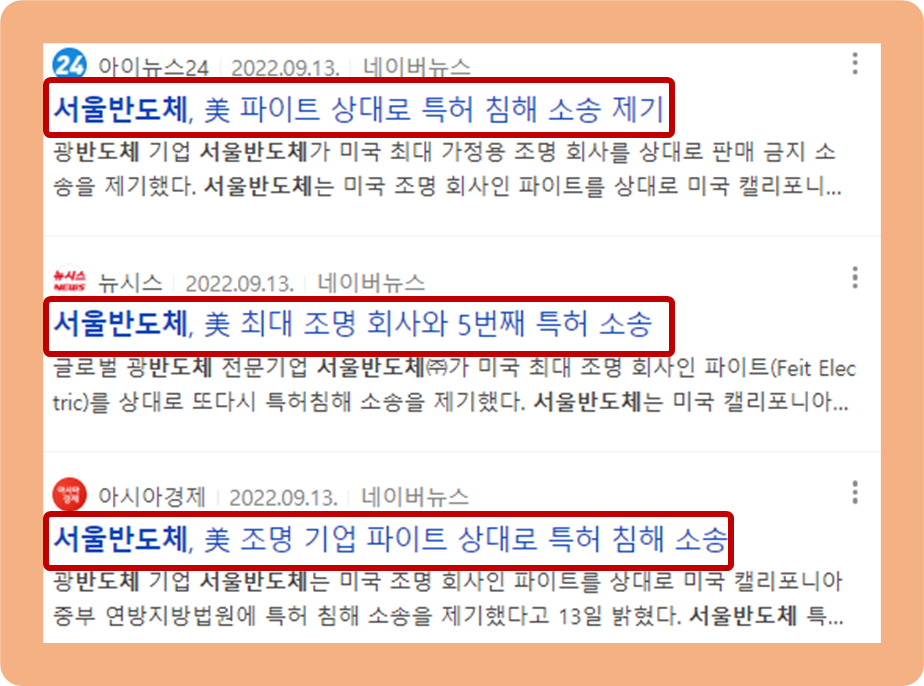 2022년 9월 13일, 서울반도체는 지난 8월 미국 최대 조명 업체인 파이트를 상대로 특허침해 소송을 제기했다고 발표했습니다.
