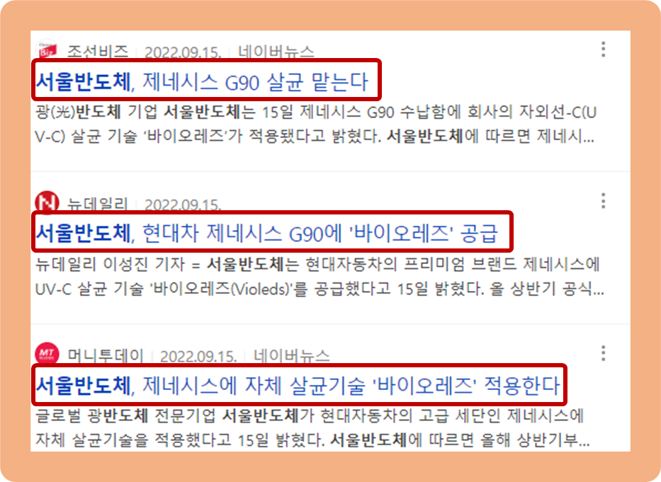 2022년 9월 15일, 서울반도체가 자사의 자체 개발 기술인 Violeds(바이오레즈)가 제네시스 G90의 뒷자석 수납함에 적용됐다는 소식을 발표했습니다.