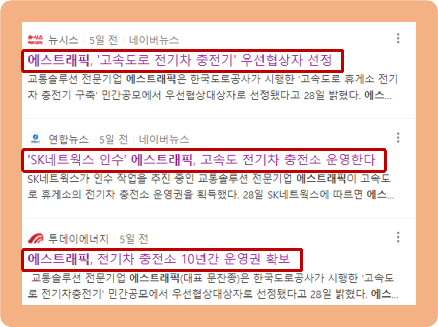 2022년 10월 28일, 에스트래픽이 한국도로공사가 시행한 고속도로 휴게소 전기차충전기 구축 민간공모에 참여해 우선협상대상자로 선정되었습니다.