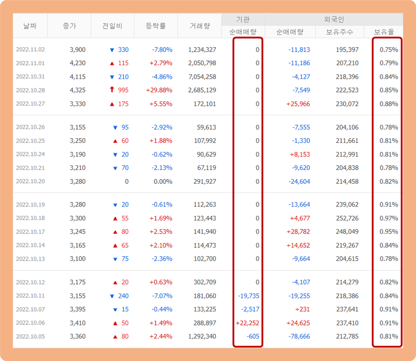 지난 1개월 동안 기관투자자 및 외국인 투자자의 주식 매매 추이에 대해 살펴보도록 하겠습니다.