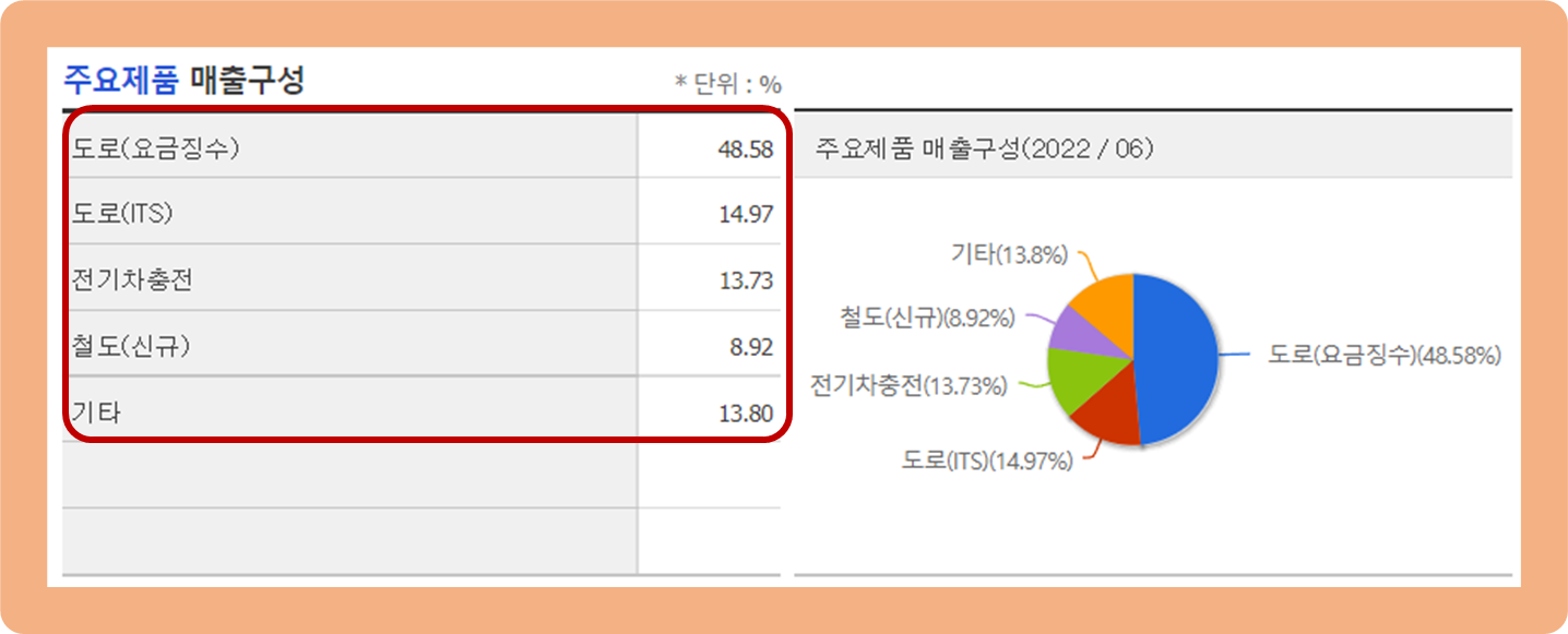 우선 도로 요금징수 부문이 약 48.6%로 총 매출의 절반 수준을 책임지고 있구요.