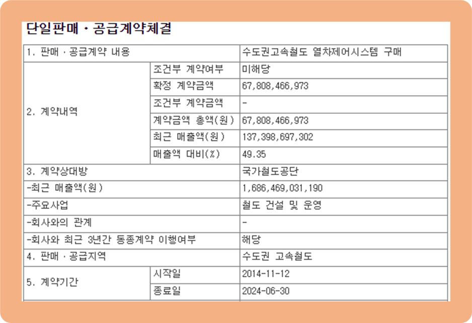 2022년 10월 19일, 당사는 국가철도공단과 약 678억원에 달하는 수도권 고속철도 열차제어시스템 구매 계약을 맺었다는 공시를 발표했습니다.