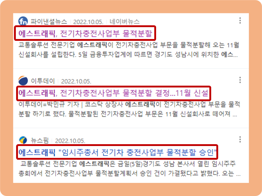 2022년 10월 5일, 에스트래픽은 전기차충전사업부 물적분할계획서 승인 건이 가결되었다는 공시를 발표했습니다.