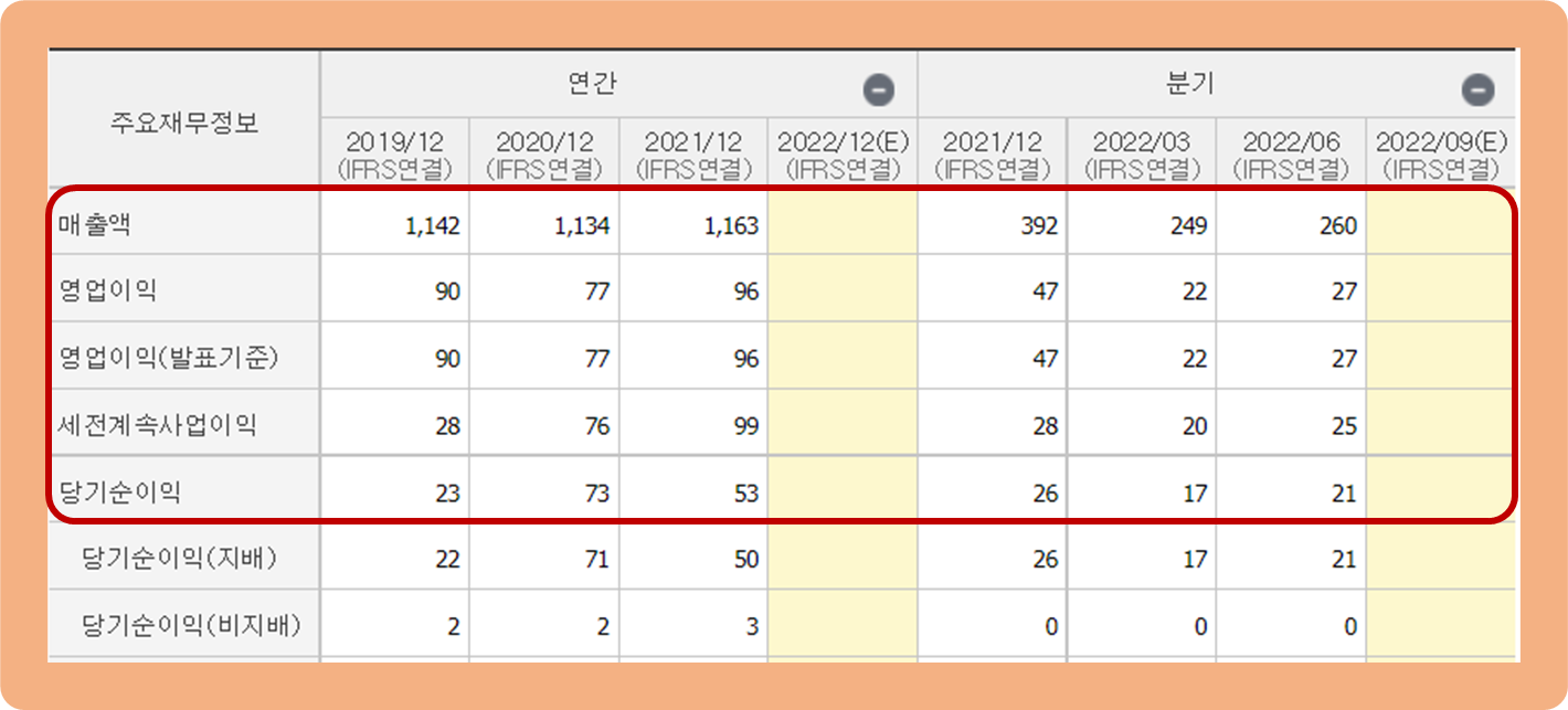 아쉽게도 연간 당기순이익은 2021년 기준 약 53억원을 기록하며 전년 대비 약 27.4% 하락한 상황이네요.