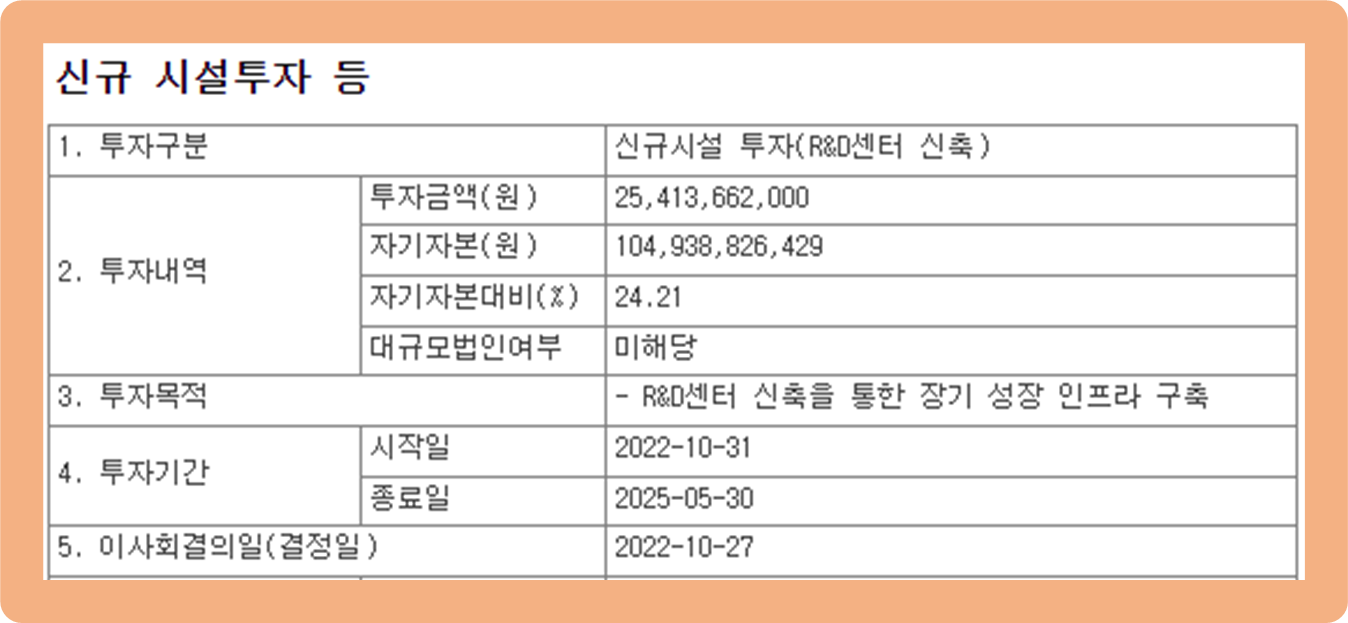 이는 자기자본인 1,049억원 중 약 24.2% 상당을 차지하는 규모이며, 투자의 주 목적은 연구개발 센터 신축을 통한 장기성장 인프라 구축이라고 하구요.