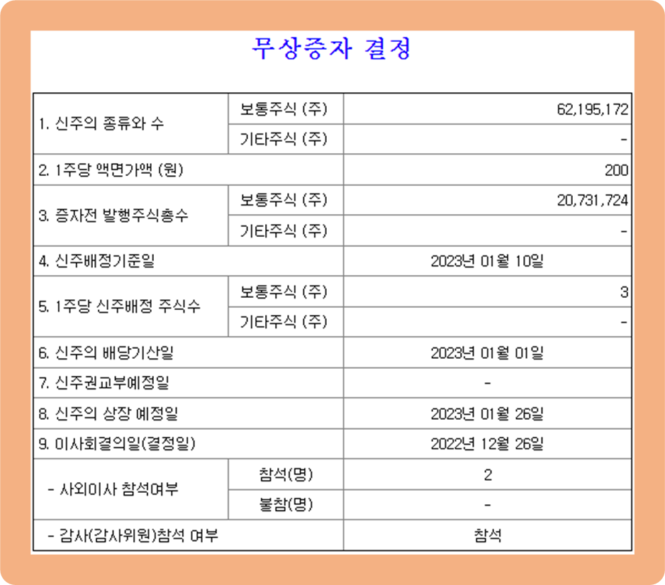 2022년 12월 26일, 당사가 보통주 1주당 3주를 배정해주는 방식의 무상증자를 결정했다는 소식을 발표했습니다.