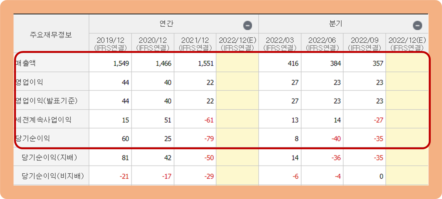 그리고 연간 당기순이익은 2021년 기준 - 79억원 손실을 기록하며, 전년 대비 적자로 전환된 상황입니다.