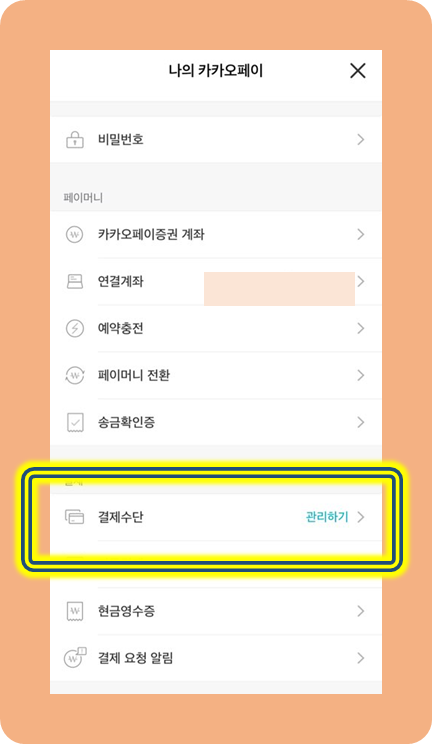 스크롤을 내리니까 결제 수단이라는 메뉴가 나옵니다.