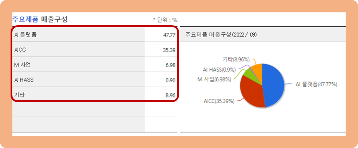 우선 AI플랫폼 부문이 약 47.8% 수준으로 가장 많은 비중을 차지하고 있구요.