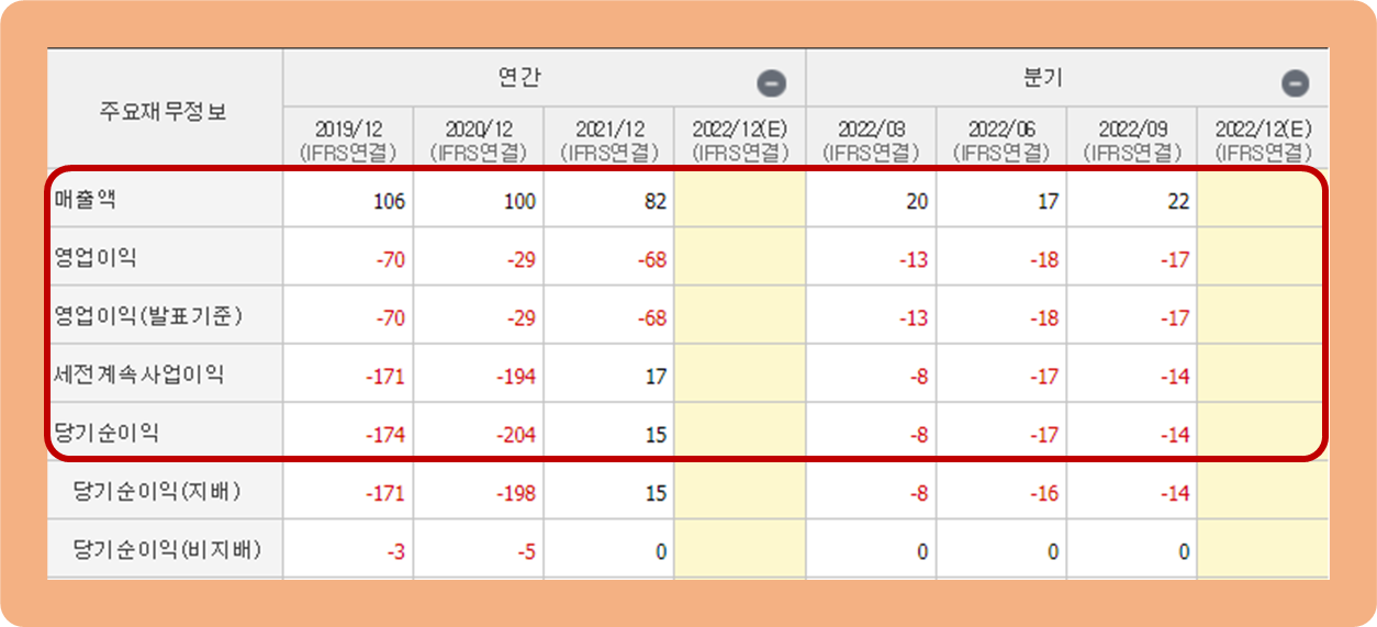 2022년 3분기 누적 영업이익은 -48억원을 기록중으로 2022년에도 적자를 이어갈 것으로 보입니다.