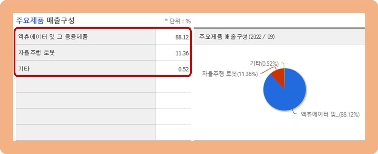 우선 액츄에이터 및 관련 제품 부문이 약 88.1%로 총 매출의 대부분을 책임지고 있구요.