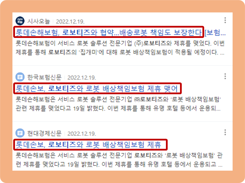 2022년 12월 19일, 로보티즈와 롯데손해보험이 '로봇 배상책임보험' 제휴를 맺었습니다.