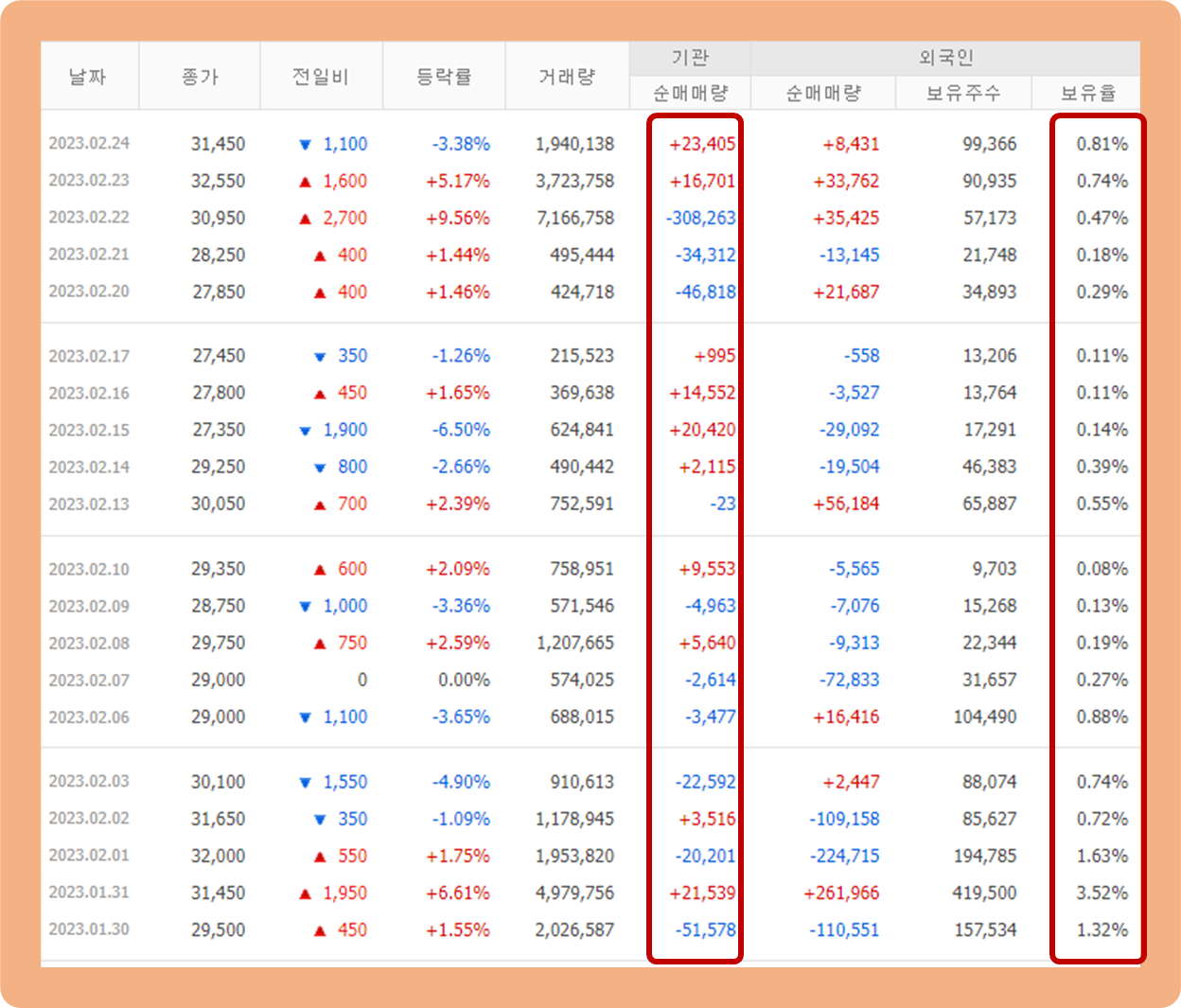 우선 기관투자자의 경우 지난 1개월 간 매도세가 매수세에 비해 우위를 점하고 있구요.
