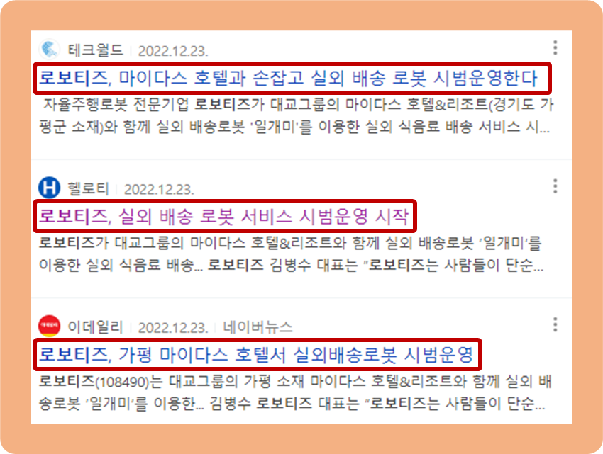 2022년 12월 23일, 로보티즈가 대교그룹의 마이다스 호텔과 함께 배송로봇 '일개미'를 활용한 실외 식음료 배송 서비스를 시범 운영한다고 발표했습니다.