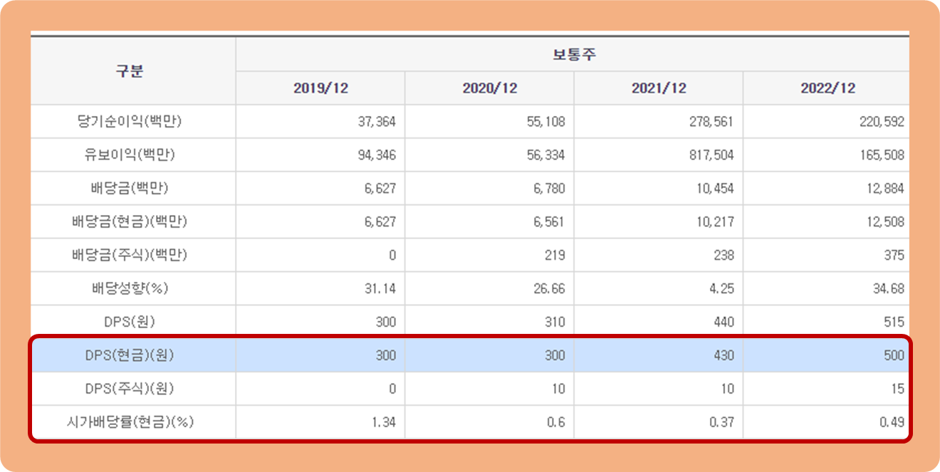 2019년, 2020년 : 300원 / 2021년 : 430원 / 2022년 500원의 배당을 실시했습니다.