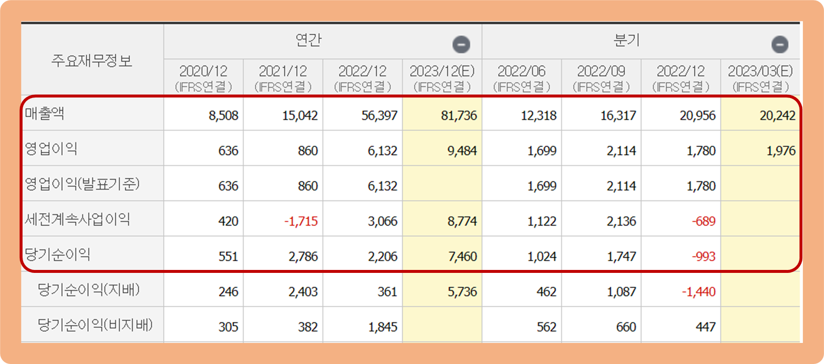 2023년 기준 연간 매출액을 보시면, 약 8.1조원을 기록하며 전년 대비 약 44.9% 상승했습니다. 지난 2020년도에는 약 8,500억원에 불과했었는데 약 3년 만에 10배 가량 성장했네요