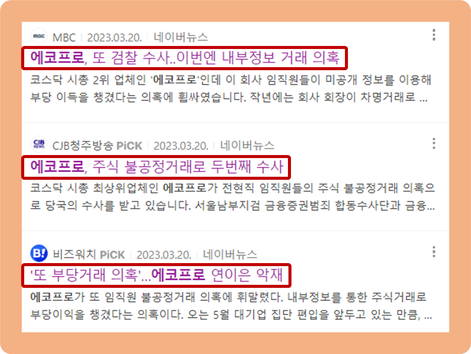 이번에 진행된 압수수색도 위 사건과 비슷한 시기에 진행된 정황을 검찰이 추가 포착하게 되어 진행된 것이라고 하며, 지난 2020~2021년 동안 에코프로 전현직 임직원이 미공개 정보 등을 이용해 부당이득을 얻은 것에 대한 조사가 이뤄질 것이라고 하네요.
